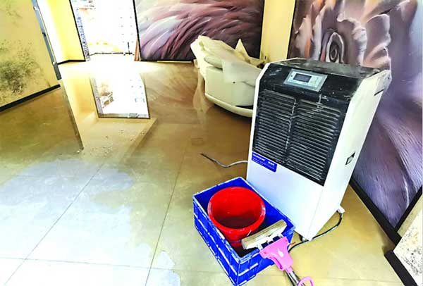 管女士带着记者来到了地下一层,记者发现,刷着乳胶漆的墙壁已经有了成片的霉斑,地上还有大约一指厚的积水,沙发、除湿机都靠在一旁。“这都是几天前那次下雨漏的水。”管女士称,夫妻俩列了个单子,地砖、墙纸、除湿机和沙发等物品,损失超过9万元。